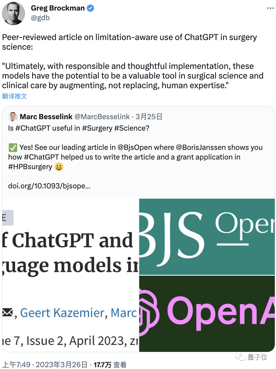 他最近转发了ChatGPT在外科科学的一篇同行评审论文,引用了这么一句话: