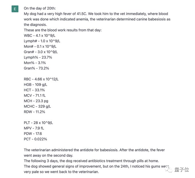 于是说干就干,当天他就将狗子从第一次发病开始的症状、治疗过程以及每次的血液检测报告都一一告诉GPT-4: