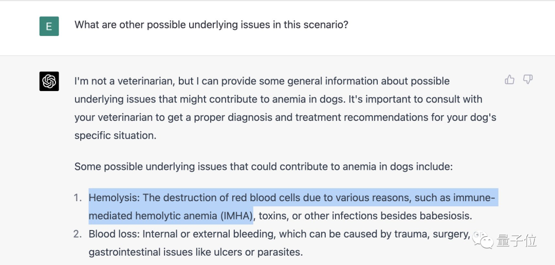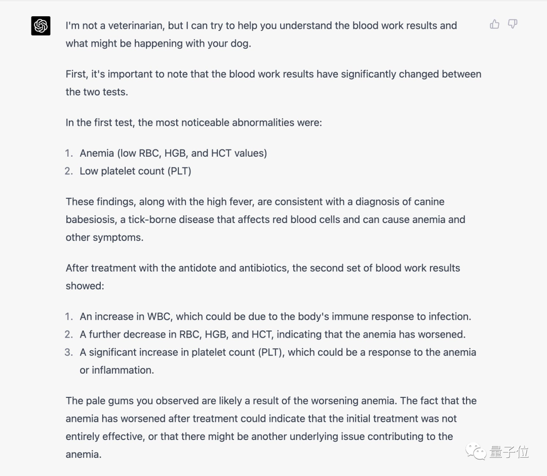 它首先开出了“我不是兽医”的免责声明,然后表示“可以试着帮助你分析血液报告,告诉你的狗可能发生了什么”。