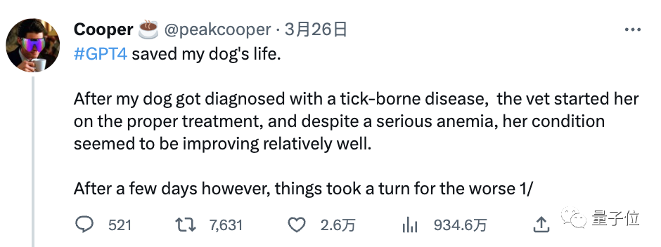 这两天,一篇关于“GPT-4救了我狗的命”的帖子属实有点火: