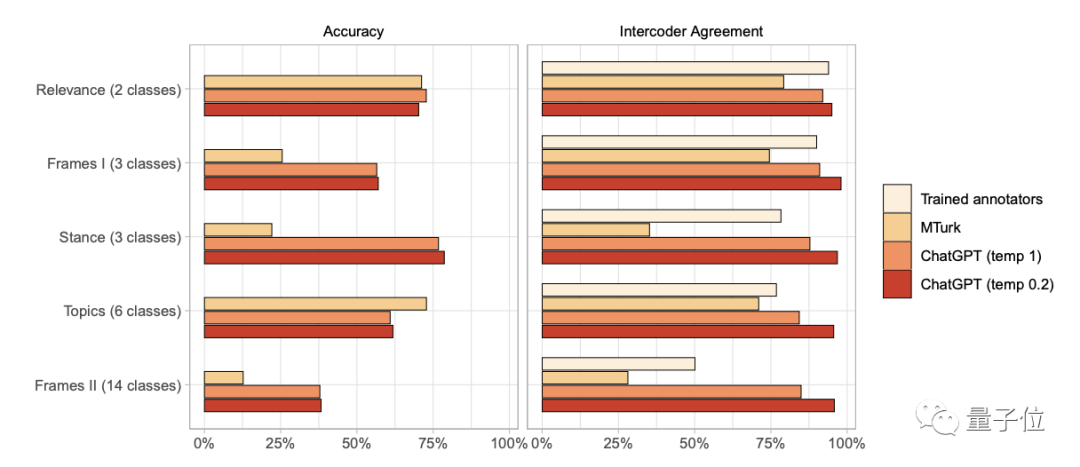 结果呢也显而易见,在准确性上,ChatGPT有五分之四的任务都要优于MTurk众包工作者。