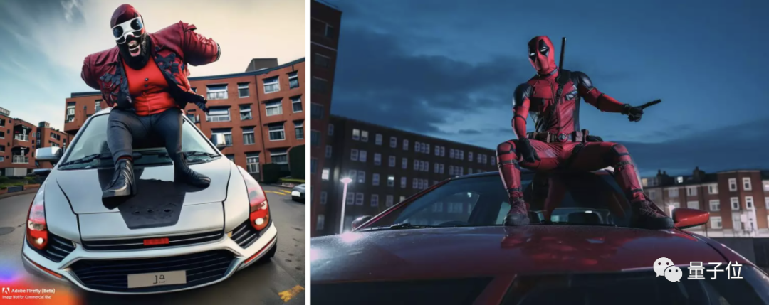 死侍在英国一所公寓大楼外的汽车顶部摆出广角姿势。