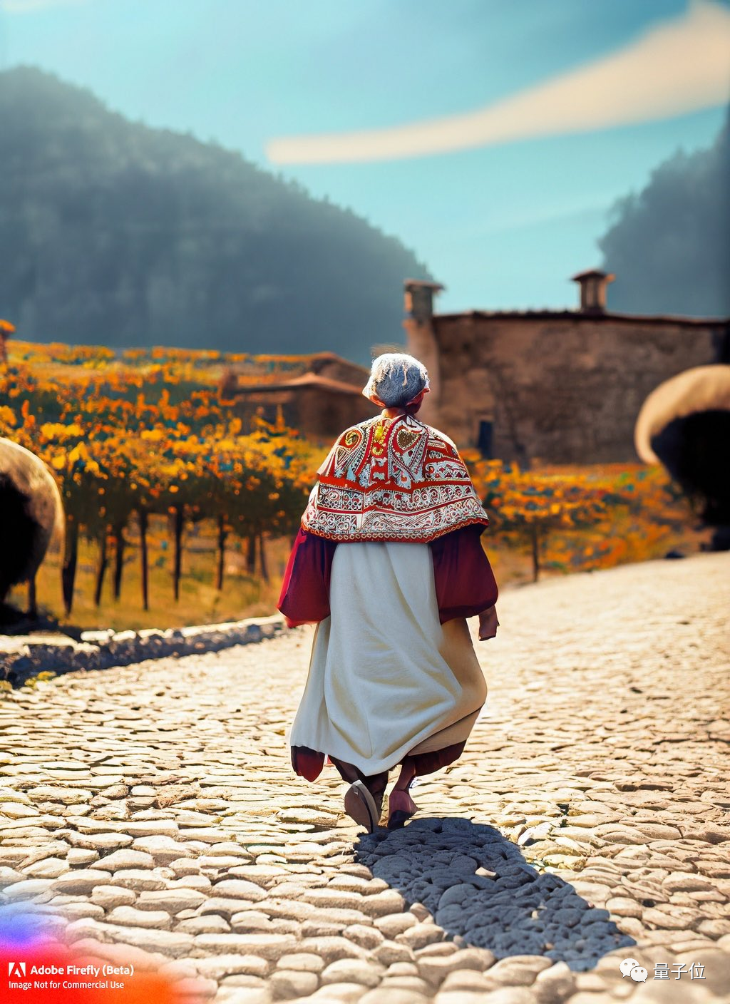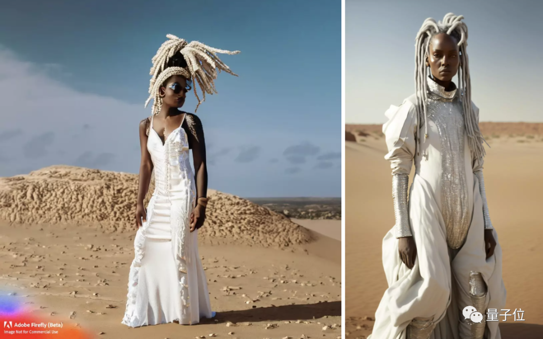 乍看一眼,两个都还行,但稍微瞧瞧就会发现Firefly给了个男扮女装的形象,手部废了,背景相比MidJourney还是输了一截。不过两者这个“白色辫子”的呈现就大哥不说二哥了。