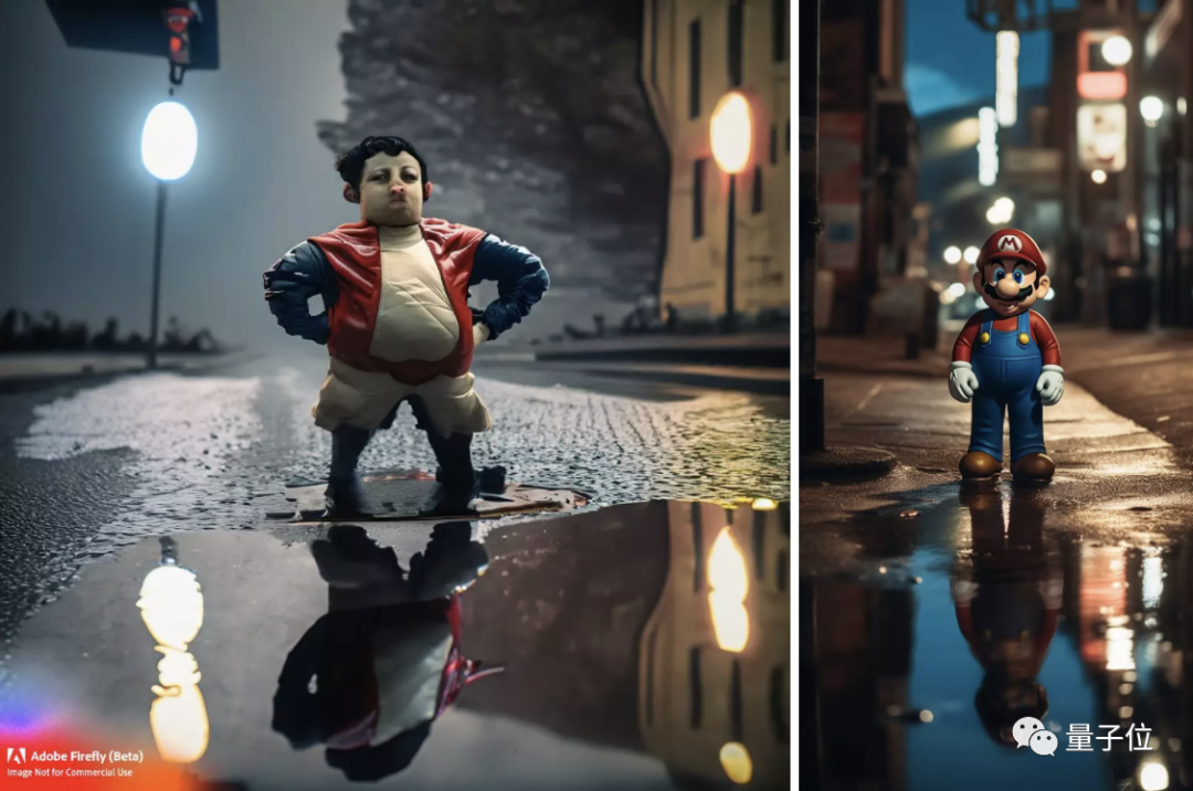 一张照片捕捉到超级马里奥在昏暗的街道上摆pose,在地上的水坑里有一个大倒影,空气中有轻微的薄雾,你知道某些事情即将发生,人们对此充满期待。这就像好莱坞电影中的场景,高产值,拟人化的镜头。