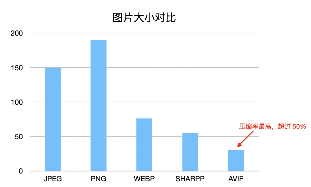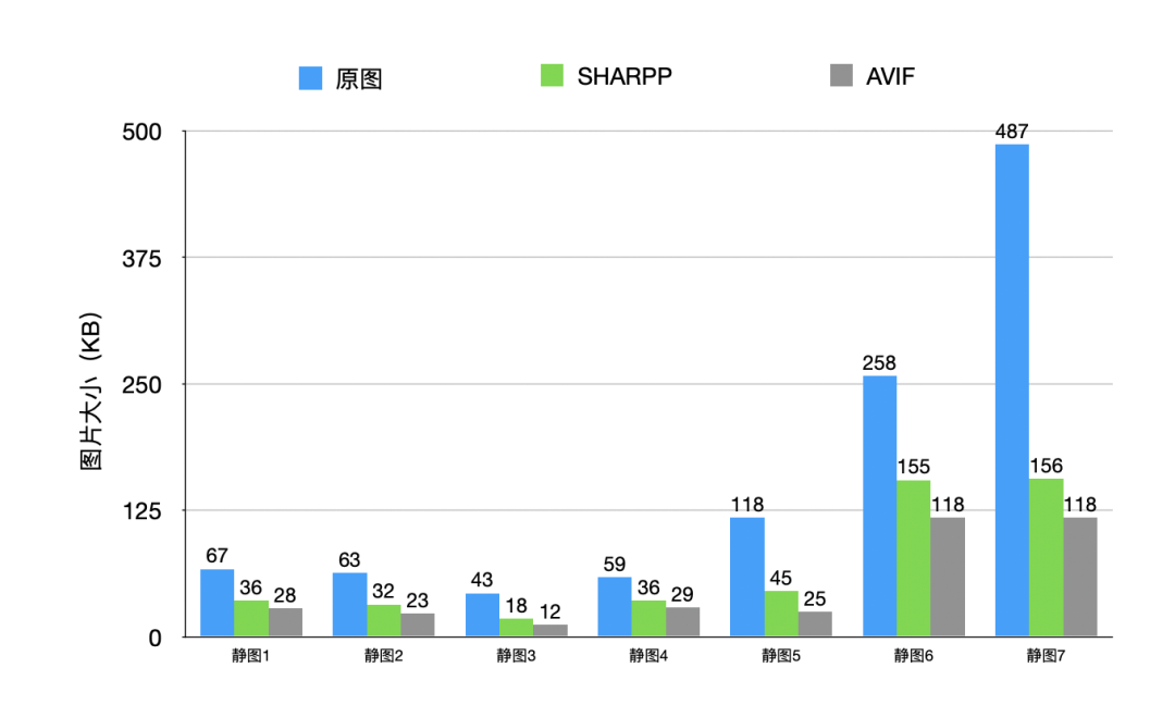 对比验证中我们采取了不同大小的图片作为样本,分别对比了压缩成 SHARPP 和 AVIF 格式的图片大小。从图表中可以明显看出AVIF图的大小对比原图有着显著降低,甚至相较SHARPP 图都有很大的优化幅度。