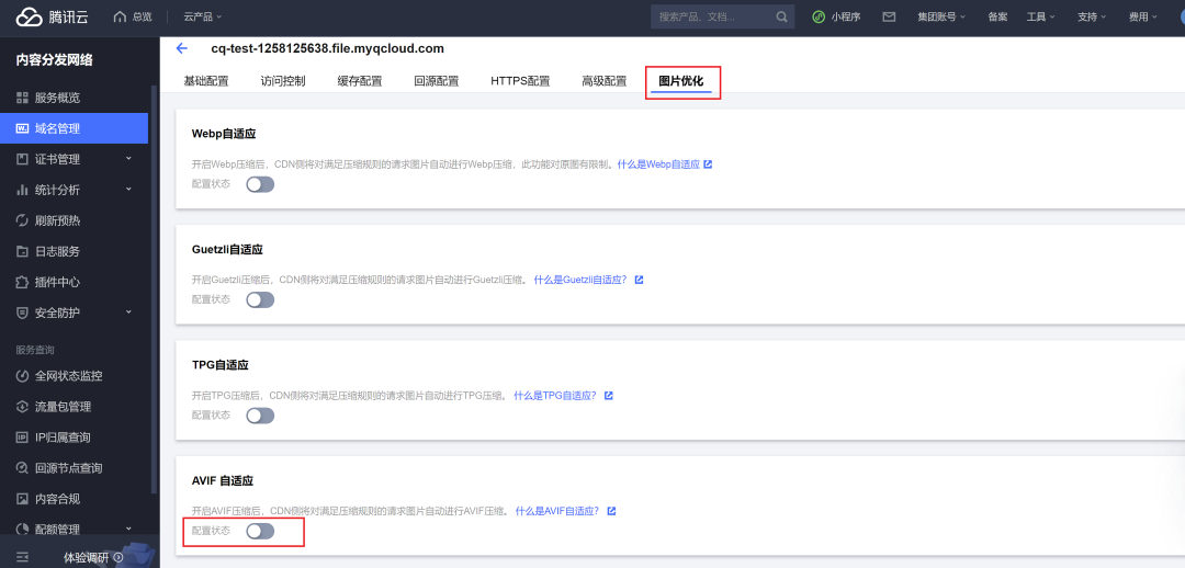 在使用方式上,数据万象的 AVIF 压缩功能也极其方便易用。只需在原访问链接上添加压缩参数即可,业务应用及切换十分便捷。此外,腾讯云数据万象与CDN服务实现了打通,仅需在腾讯云CDN控制台开启配置开关,即可实现域名级别的批量图片优化,十分便捷: