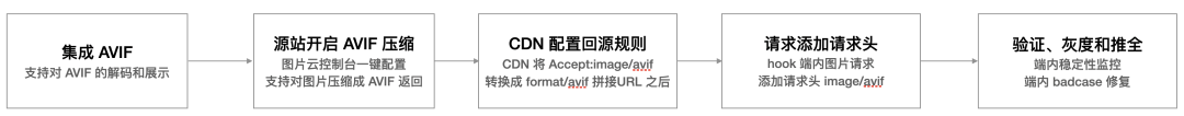 在端内我们通过 hook 图片请求,在请求头的 accept 中携带 image/avif 标记当前环境支持 AVIF 类型图片。相比直接在 URL 后缀拼接 format 参数,在把域名适配支持 AVIF 后,Web 端可以直接生效,也节省 Web 端的图片带宽成本,实施流程如下: