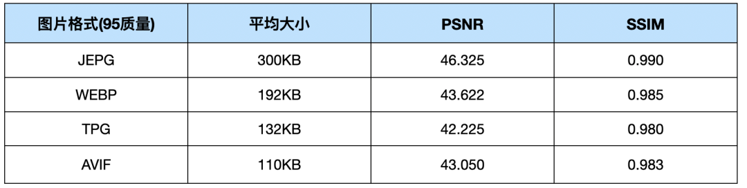 使用 AVIF 压缩图片是否会造成体验上的影响?肉眼观感较为主观,无法量化。所以我们也引用了一些客观的指标来进行对比。这里使用 PSNR(峰值信噪比)和 SSIM(结构相似性)来衡量 AVIF 压缩之后的图片质量:其中 PSNR 越高,压缩后失真越小,SSIM 值越大,图像质量越高。