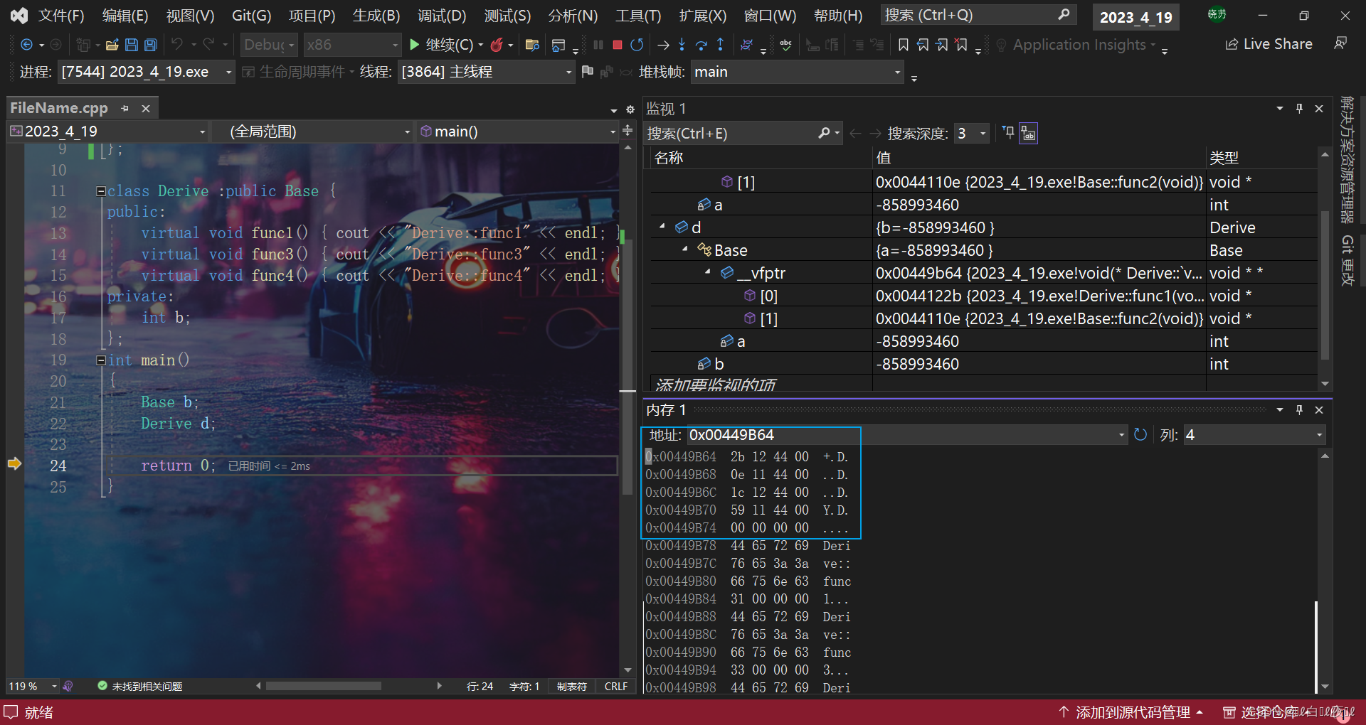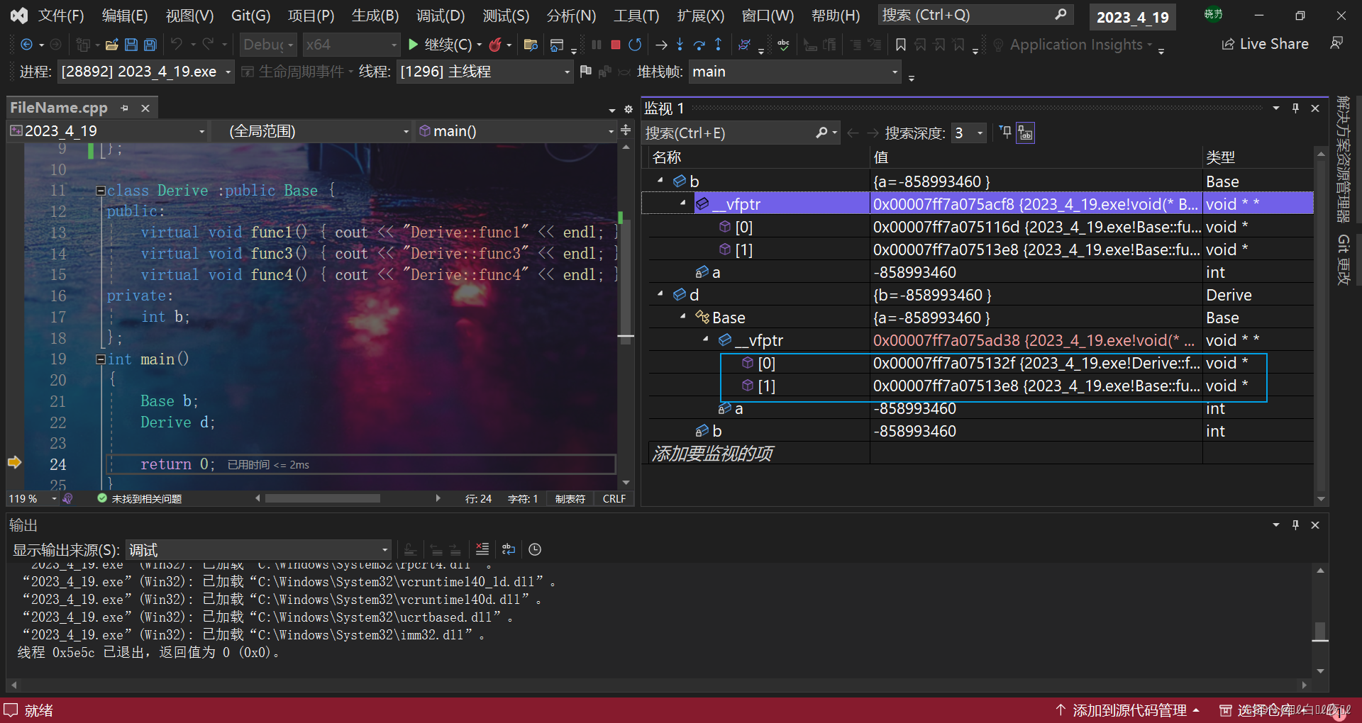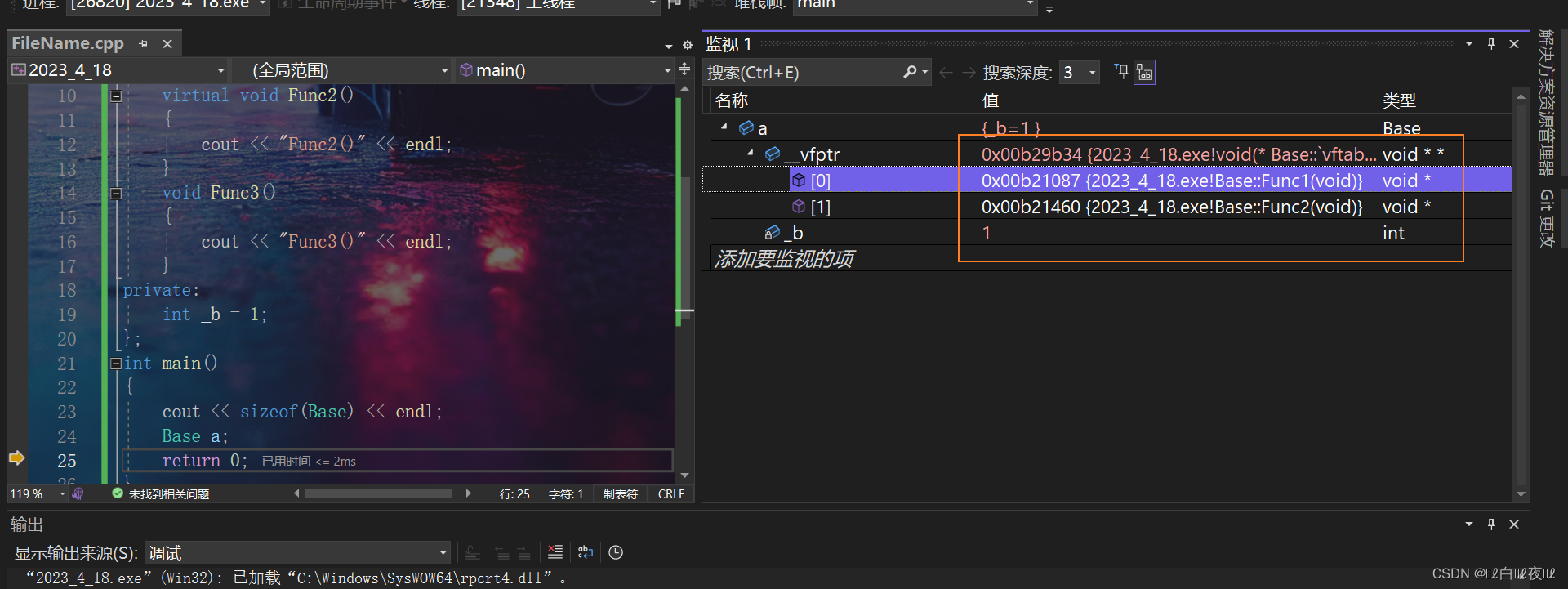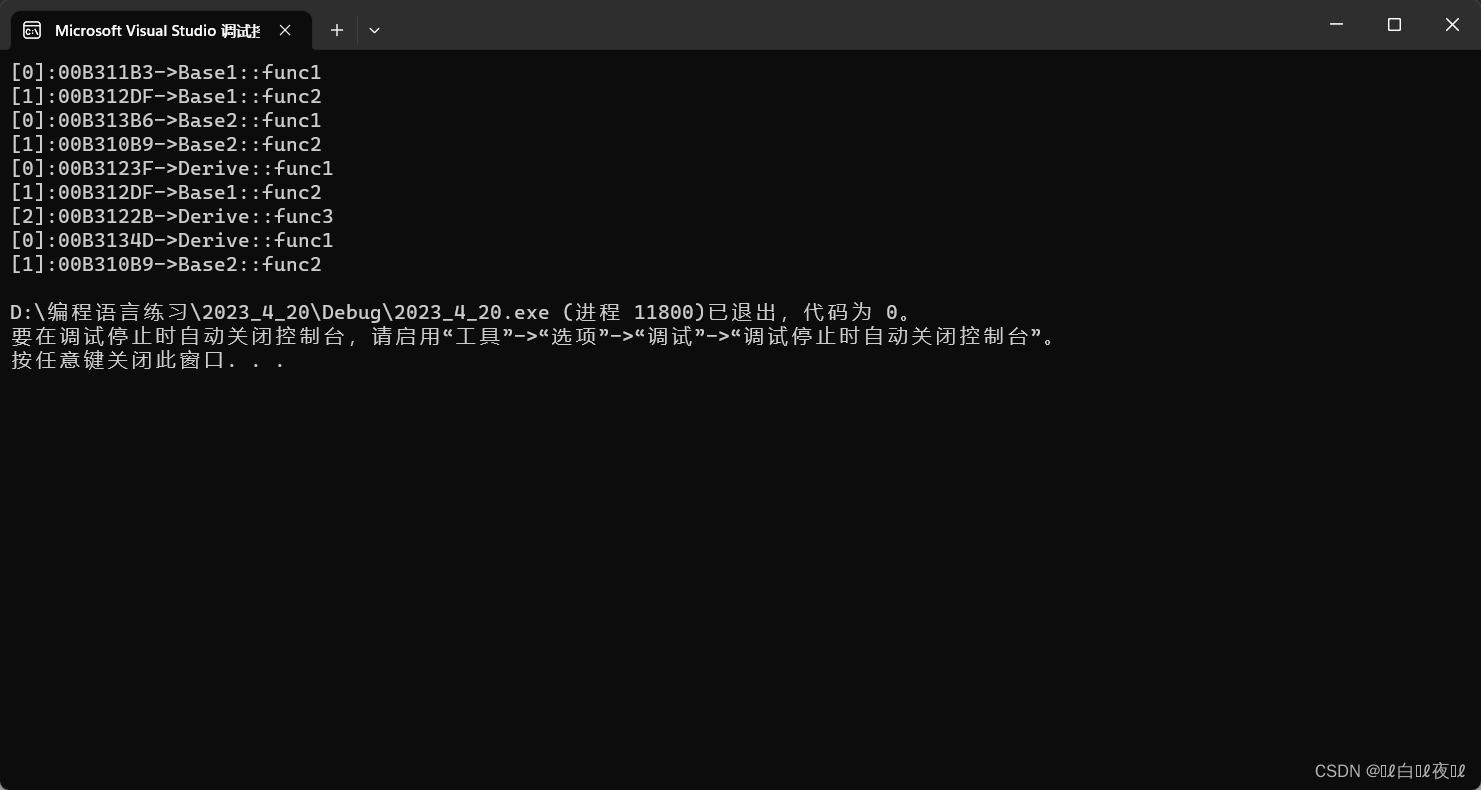 这里也将func3和func4的函数地址给显示出来,顺便说一下,在VS编译器下,虚表是以空指针结尾的。 但是这样看有些麻烦,我们想个办法给他打印出来。
