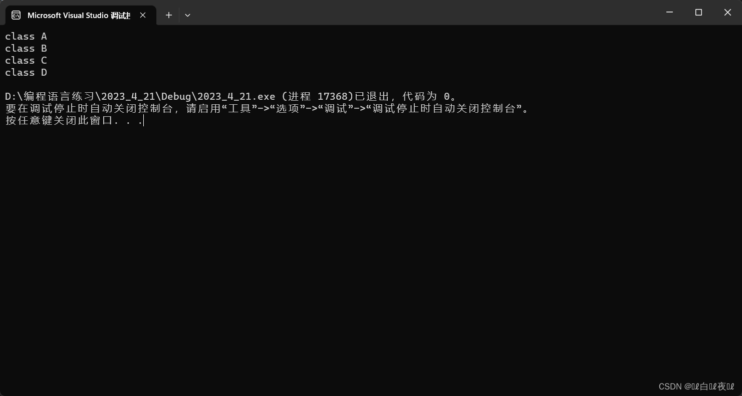 D(const char* s1, const char* s2, const char* s3, const char* s4) :B(s1, s2),C(s1, s3)//这里就不用初始化A了,因为有两份A,在B和C中,B和C就会去调用A的初始化