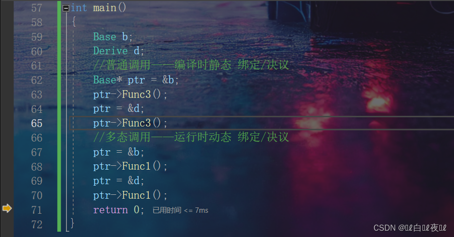 这里也叫做多态调用。 之前的调用都是普通调用,一直都和对象的类型有关。 多态调用是跟指向的对象有关。 如果改成普通调用就是类型是谁就去调用谁的成员函数,多态调用就是指向的对象是谁就去调用谁的虚函数。