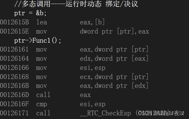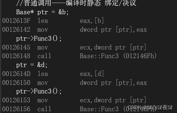 多态调用更长。 这里差别就在于,根本不在乎是指向哪里,因为有虚表的存在,如果指向父类就去父类的虚表中找,如果指向子类就去子类的虚表中找。 在汇编当中eax里面存的就是虚表指针数组。