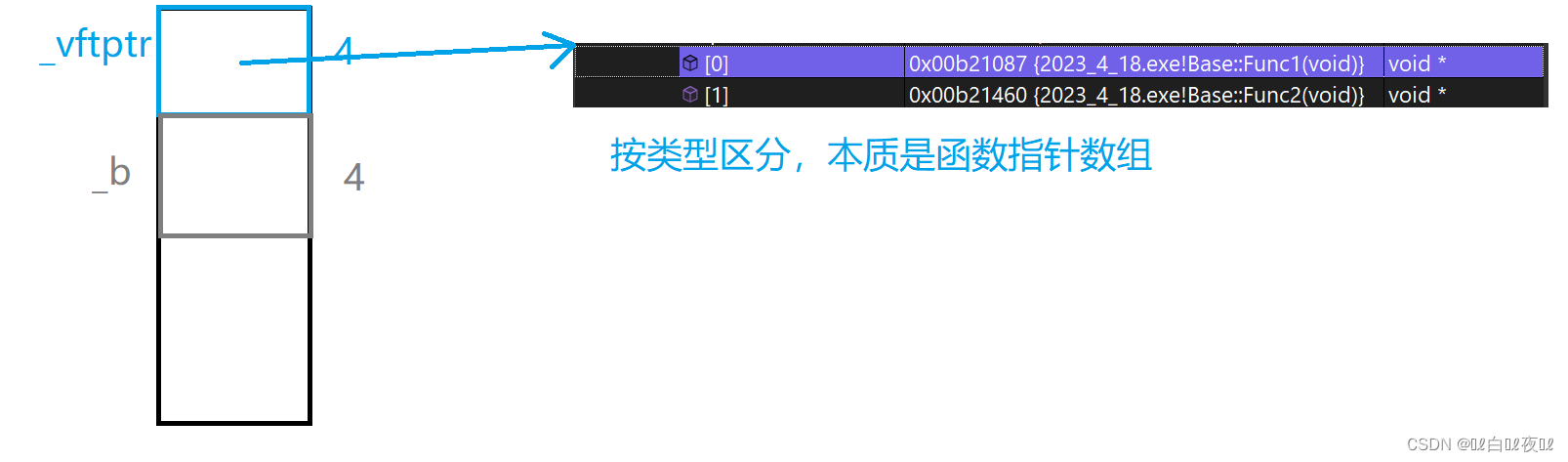 这里多出来了一个_vfptr,这个叫做虚表/虚函数表,里面储存的是虚函数的地址。