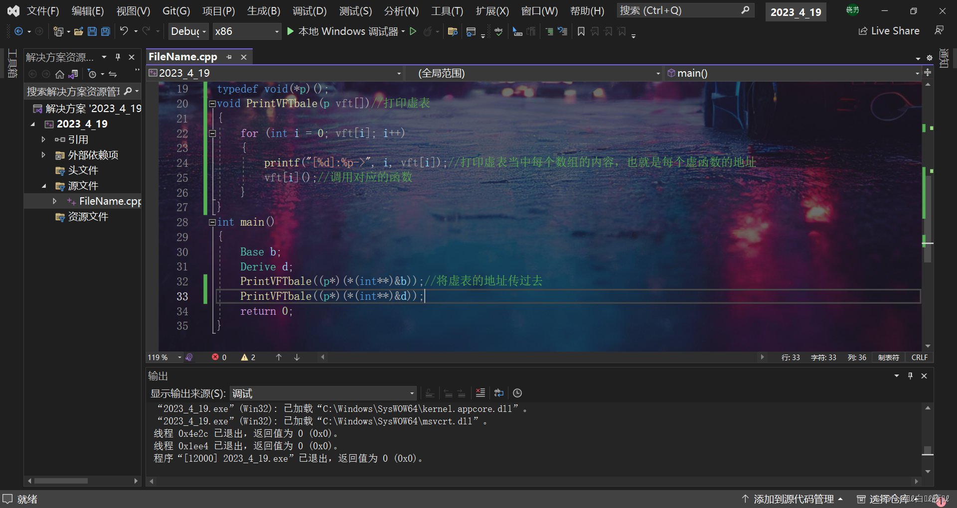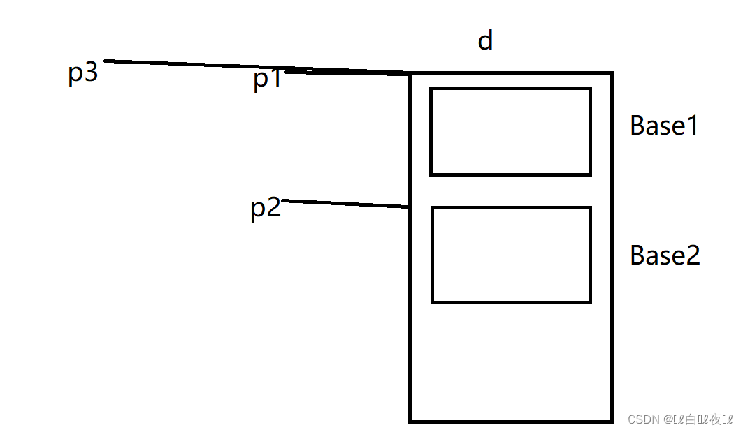 PrintVFTbale((p*)(*(void**)((char*)/*不强转就不是+1跳过一个字节了*/ &d + sizeof(Base1))));//想要打印第二个虚表就要跳过第一个虚表的地址