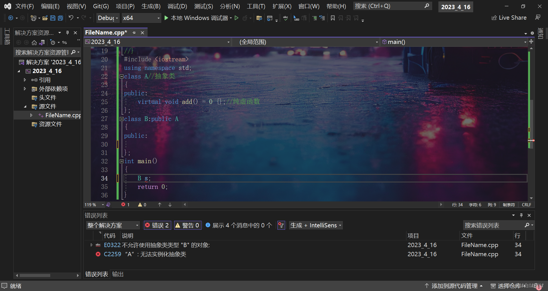 在虚函数的后面写上 =0 ,则这个函数为纯虚函数。包含纯虚函数的类叫做抽象类(也叫接口类),抽象类不能实例化出对象。派生类继承后也不能实例化出对象,只有重写纯虚函数,派生 类才能实例化出对象。纯虚函数规范了派生类必须重写,另外纯虚函数更体现出了接口继承。