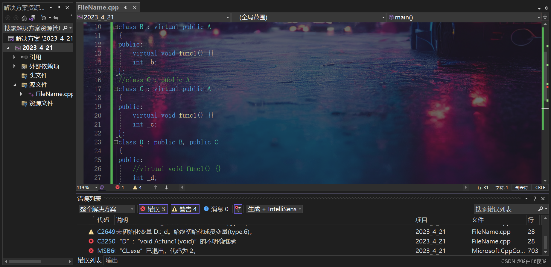 }如果是菱形继承,这样重写虚函数是没有问题的,因为B和C都有一个A。 但如果是菱形虚拟继承就不可以了,因为A类变成了一个,B和C进行重写A类的函数的时候编译器无法分辨应该按照B还是C进行重写。