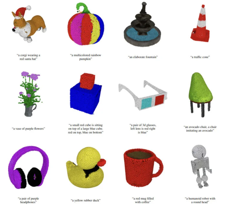 Point-E从文本描述中生成的点云的一些例子