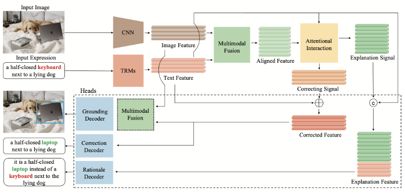 为此,浪潮信息前沿创新团队探索了真实世界中,由于人类语言错误导致的多模态失配问题,首次提出视觉定位文本去噪推理任务FREC,并构建了首个可解释去噪视觉定位模型FCTR。