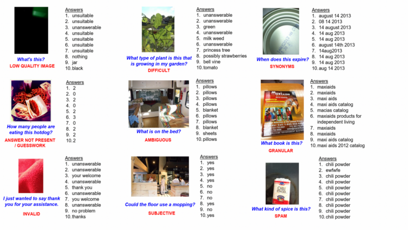 卡内基-梅隆大学等机构构建了一个盲人视觉数据库“VizWiz”,并发起全球多模态顶级视觉问答挑战赛VizWiz-VQA盲人视觉问答挑战赛,其模式是给定一张盲人拍摄的图片和问题,然后要求给出相应的答案。