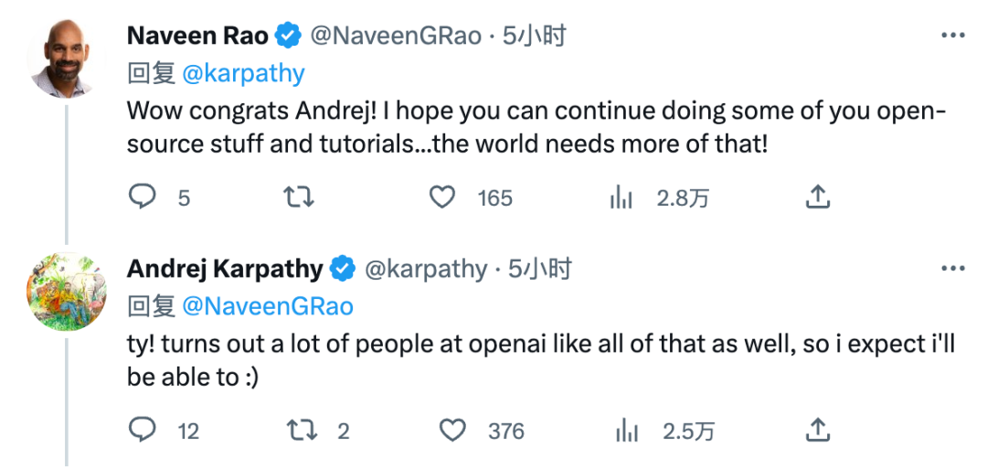 如今选择回归 OpenAI,Andrej Karpathy 在回复推特用户「我希望你能继续做一些开源的东西和教程......这个世界需要更多!」的希望时说道,“事实证明,OpenAI 的很多人也喜欢这些,所以我希望我也能够。”