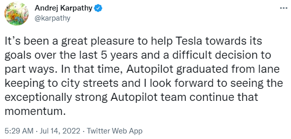 万万没想到,一语成谶,四个月休假结束之后,Karpathy 在 7 月宣布,他不会回到特斯拉。