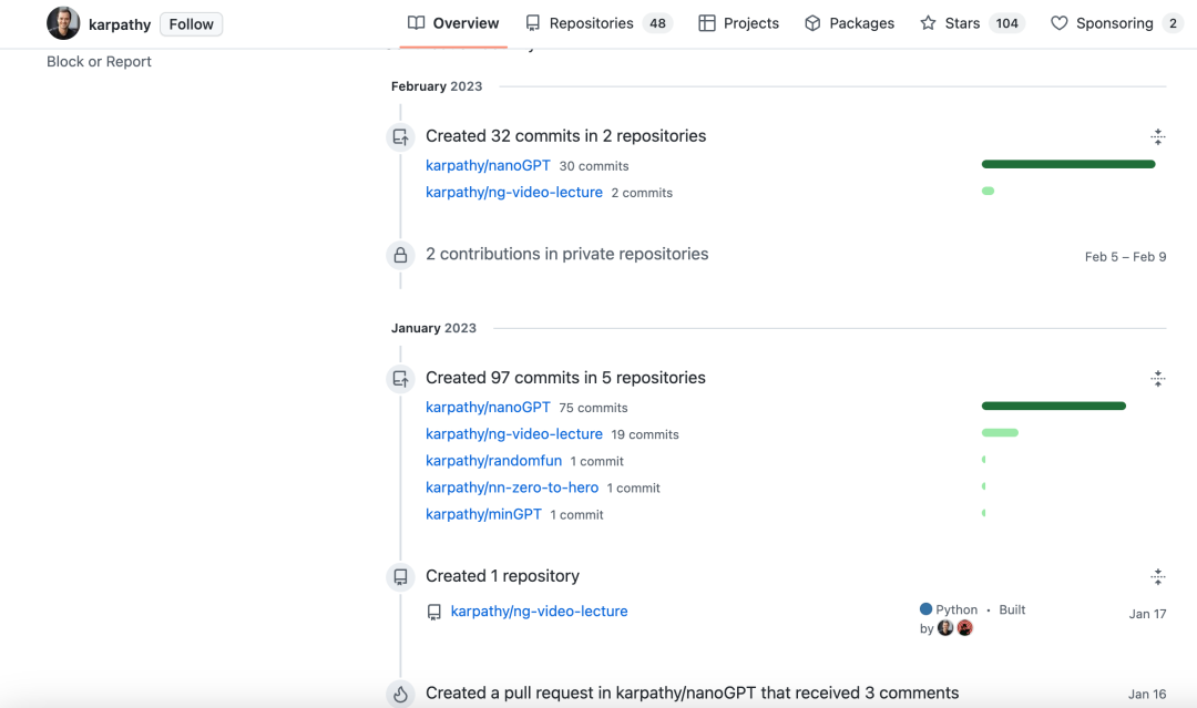 因此,离开之后,Andrej Karpathy 并没有急着加入下一家公司或者组织,而是他活跃在一些技术社区,如 GitHub(https://github.com/karpathy):