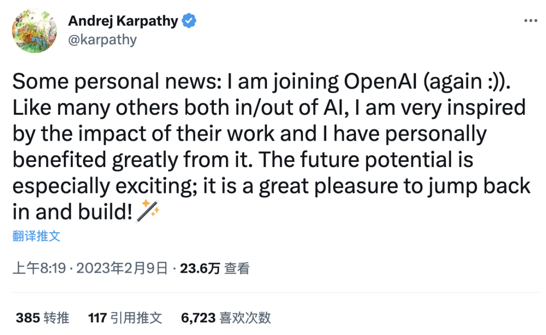 祝福 Andrej Karpathy 在 OpenAI 开启新征程。