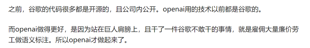 「OpenAI对LLM有强大的执念,这是Google这类公司完全比不上的。当然人的差距只是一个方面,数据的差距以及对待数据的态度才是其成功的关键。人可能可以花钱挖回来,技术可能可以补上,但数据的差距Google短时间内没法追上。」