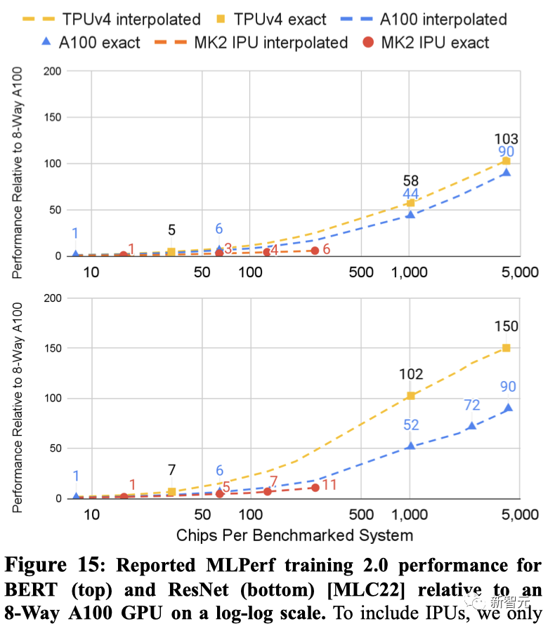 TPU v4和A100的MLPerf结果都扩展到比IPU更大的系统(4096个芯片对比256个芯片)。