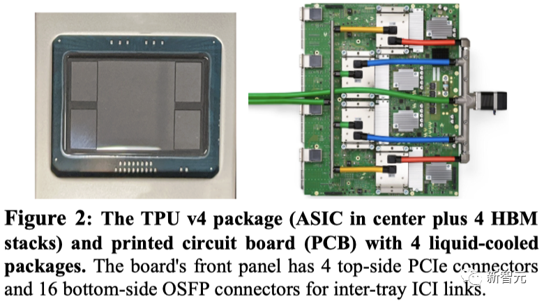 谷歌展示了TPU v4的封装,以及4个安装在电路板上的封装。