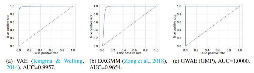 聚类 为了评估基于聚类元先验获得的表征,该研究进行了一项 Out-of-Distribution(OoD)检测。MNIST 数据集被用作 In-Distribution(ID)数据,Omniglot 数据集被用作 OoD 数据。虽然 MNIST 包含手写数字,但 Omniglot 包含不同字母的手写字母。在这个实验中,ID 和 OoD 数据集共享手写图像领域,但它们包含不同的字符。模型在 ID 数据上进行训练,然后使用它们学到的表征来检测 ID 或 OoD 数据。在 VAE 和 DAGMM 中,用于 OoD 检测的变量是先验的对数似然,而在 GWAE 中,它是 Kantorovich potential。GWAE 的先验是用 GMP 构建的,以捕捉 MNIST 的簇。ROC 曲线显示了模型的 OoD 检测性能,其中所有三个模型都实现了近乎完美的性能;然而,使用 GMP 构建的 GWAE 在曲线下面积(AUC)方面表现最佳。