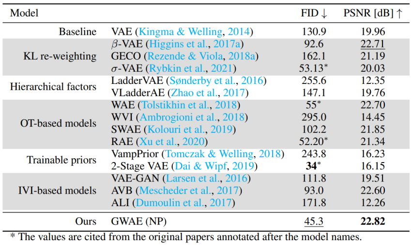 作为基于自动编码器的生成模型的性能 为了评估 GWAE 在没有特定元先验的情况下对一般情况的处理能力,使用 CelebA 数据集进行了生成性能的评估。实验使用 FID 评估模型的生成性能,使用 PSNR 评估自编码性能。GWAE 使用 NP 获得了第二好的生成性能和最佳的自编码性能,这表明其能够在其模型中捕捉数据分布并在其表示中捕捉数据信息的能力。