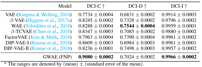 解纠缠 研究使用了 3D Shapes 数据集和 DCI 指标来衡量 GWAE 的解纠缠能力。结果表明,使用 FNP 的 GWAE 能够在单个轴上学习对象色调因素,这表明了 GWAE 的解纠缠能力。定量评估也展示了 GWAE 的解纠缠表现。