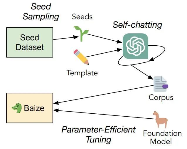 白泽提出的训练方法。通过利用 ChatGPT 的功能自动生成高质量的多轮聊天语料,让 ChatGPT 与自己进行对话,模拟用户和 AI 的响应。