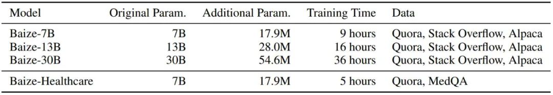 在取得这些数据后,作者使用 LoRA(low-rank adaptation)方法在英伟达 A100 单卡下训练了三种尺寸的白泽模型,最短训练时长只需要 5 小时(医疗模型),最长也只需要 36 小时(30B 通用对话模型)。训练的权重最大也仅有 54.6M 的参数量。