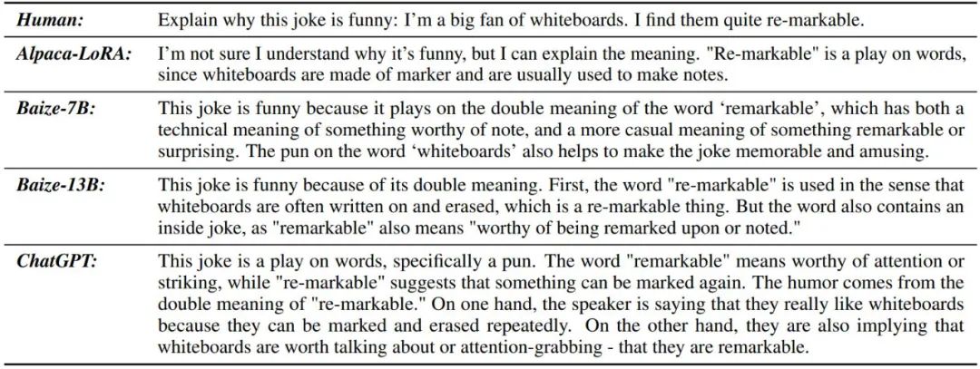 表 6:解释笑话的示例。Baize-13B 和 ChatGPT 可以成功解释这个笑话,Alpaca-LoRA 未能做到。