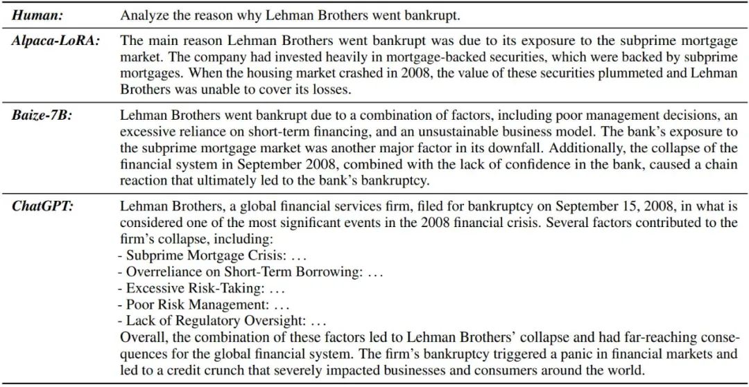 表 5:解释雷曼兄弟破产。总体而言,Baize-7B 提供了比 Alpaca-LoRA 更全面的答案,同时包含了 ChatGPT 答案中的大部分要点。另一方面,ChatGPT 提供了更长更详细的答案。