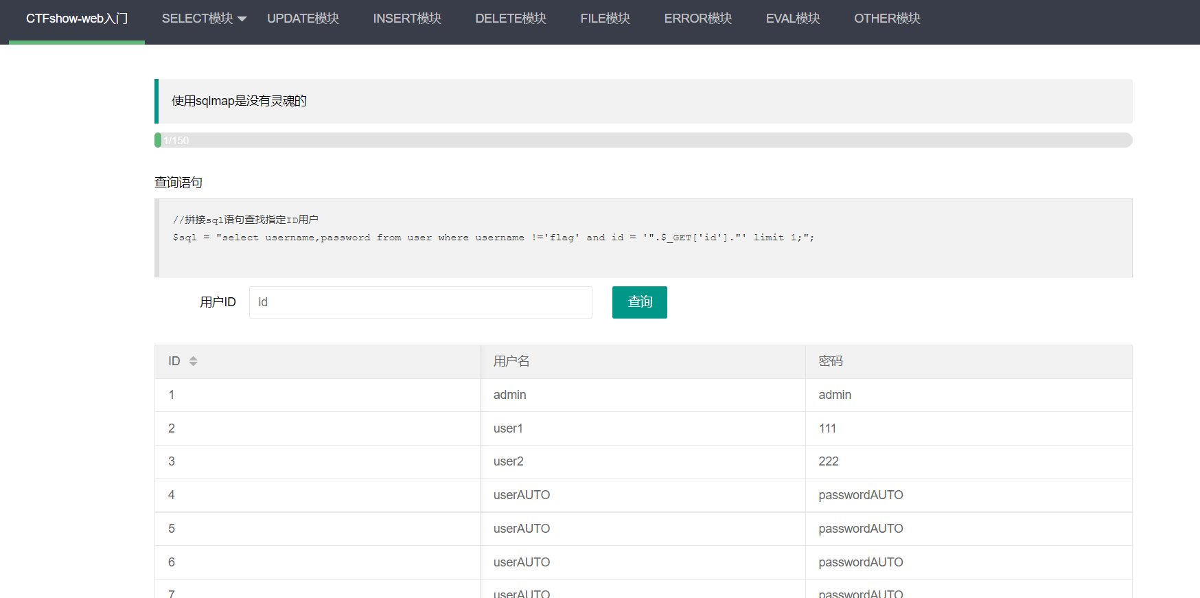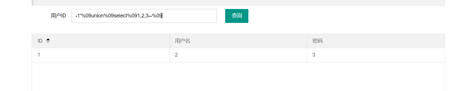 $sql = "select username,password from user where username !='flag' and id = '".$_GET['id']."' limit 1;";由sql查询语句可知,这里是由单引号包围的字符型注入.有一点奇怪的地方是,这里select的字段为2个(且没有select id值下方不可能存在id的结果)。按理order by出来应为字段数为2.估计是出题人展示错了sql查询语句。