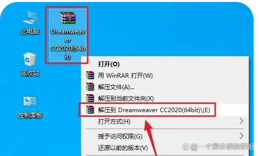 1、右键点击下载好的“Dreamweaver CC2020”压缩包,选择解压到Dreamweaver CC2020。