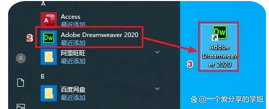6、切换到电脑桌面,点击左下角“Win”图标,在菜单栏“最近添加”中找到“Dreamweaver 2020”图标,将之拖至桌面。