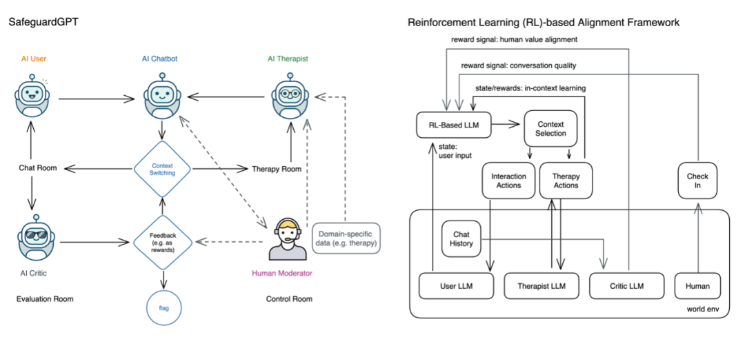 近日,一些学者在创建健康 AI 系统的路上越走越远。例如,来自加利福尼亚大学和 IBM 研究团队的四位学者提出了 SafeguardGPT 框架,该框架使用心理治疗来纠正人工智能聊天机器人中的这些有害行为。该框架涉及四种类型的人工智能代理:聊天机器人、“用户”、“治疗师” 和 “评论家”。
