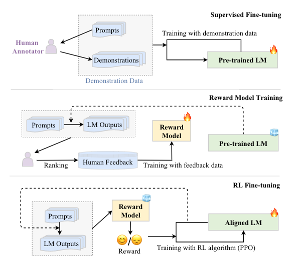 RLHF 通过利用收集的人类反馈数据对 LLMs 进行微调,这有助于改进对齐标准(例如,有用性、诚实性和无害性)。RLHF 使用强化学习算法,通过学习奖励模型使 LLM 适应人类反馈。这种方法将人类纳入训练循环,以开发与人类对齐的 LLMs,如 InstructGPT。