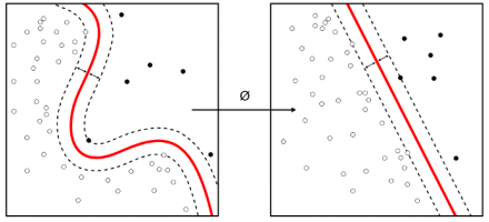 核机通过非线性变换将数据点嵌入特征空间,在变换空间中,样本可以被线性分离。来源:Alisneaky向量:Zirguezi,CC BY-SA 4.0