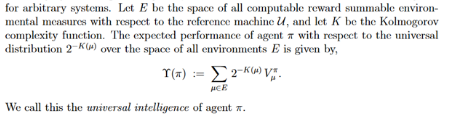 简单地说,智能是指智能体(Agent)从全部环境空间中提取价值的能力,并根据环境的复杂性来确定权重。利用柯尔莫戈罗夫(Kolmogorov)复杂性函数来度量复杂程度:它是复杂程度的信息论度量,与生成它所需的最短行代码相对应,与将智能当成压缩的思想相关连,对应于最佳压缩、高效记忆的一种表示(我在关于“混沌理论和计算不可约性”的文章中更详细地讨论了类似的思想)。当发生噪声过拟合时,必须记住这个公式,因为在信息理论中,噪声是不相关的,是无意义的解释,它不包含与过去或未来相关的信息。