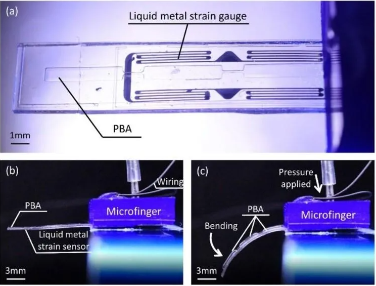 微指上还有一条充满液态金属的单独通道,当微指弯曲时,通道拉长,液体金属就变少,通过测量金属的电阻,你可以知道手指被弯曲了多少,这种驱动和力感应的结合意味着,人的触觉系统可以用作力反馈接口:当你移动手指时,微指也会移动,同时力也可以传递回给你,让你感受到微指的感觉。