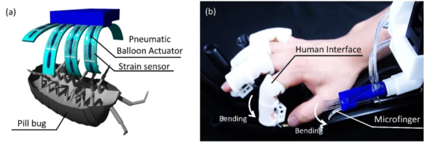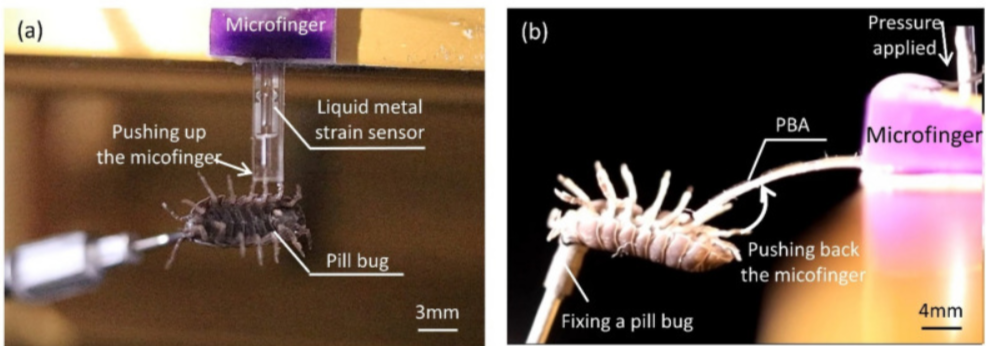 微小的手指移动并对躺在地上的西瓜虫施加力量。西瓜虫会对外力做出反应,作用于微型手指,微型手指可以通过它们的应变传感器来检测西瓜虫的反作用力,微指的主动感应使微指与昆虫的相互作用成为可能。