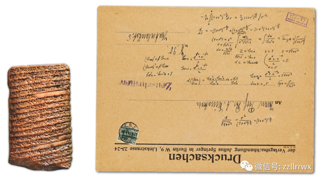 左图:公元前2000年的巴比伦黏土片,上面刻有算术表。图片提供:Osama Shukir Muhammed Amin FRCP(Glasg);右图:一个信封,上面有阿尔伯特·爱因斯坦在1919年手写的计算结果。图片提供:阿尔伯特·爱因斯坦档案馆,希伯来大学。