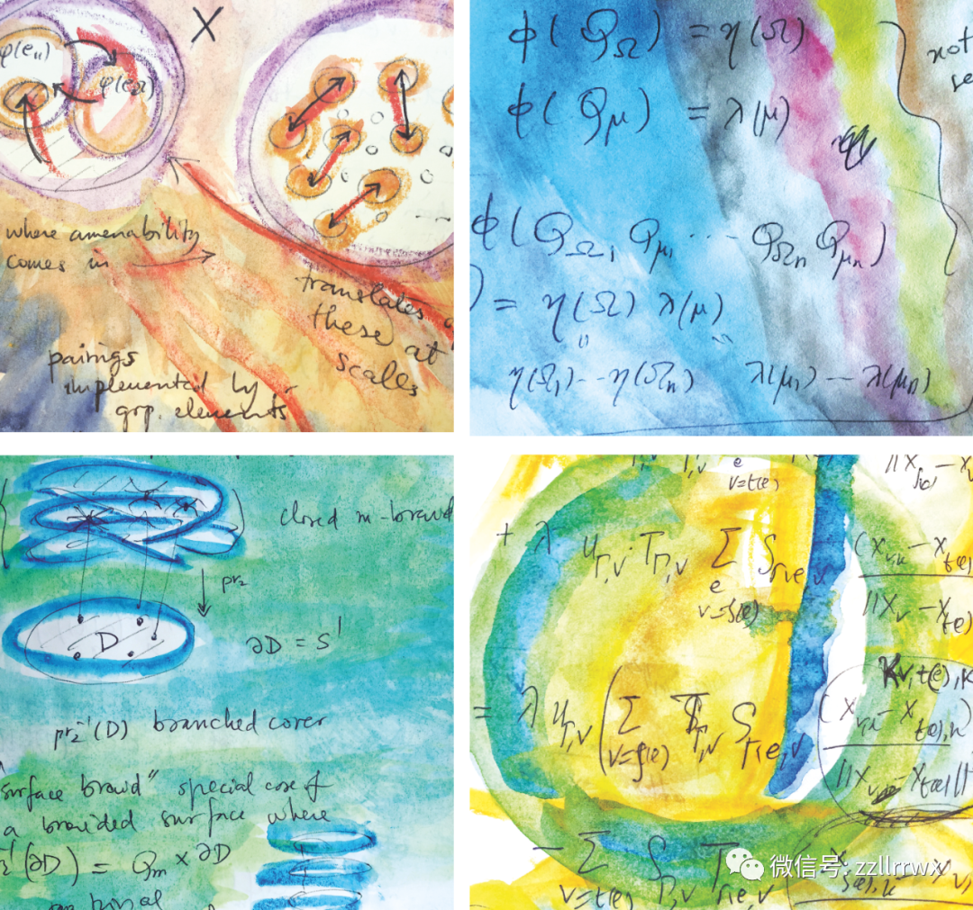 马蒂尔德·马可利(Matilde Marcolli)是罗伯特·克里斯蒂(Robert F. Christy)数学计算和数学科学教授,她喜欢通过在她的方程上绘画来创作彩色水彩画。她说,创作过程有助于她专注于数学研究。“从某种意义上说,这是一种冥想,你正在看你刚刚写的计算并思考它们;绘画的过程有助于在头脑中形成联系。这就像一种联觉形式(synesthesia),数学思想带有附加的颜色和形状。
